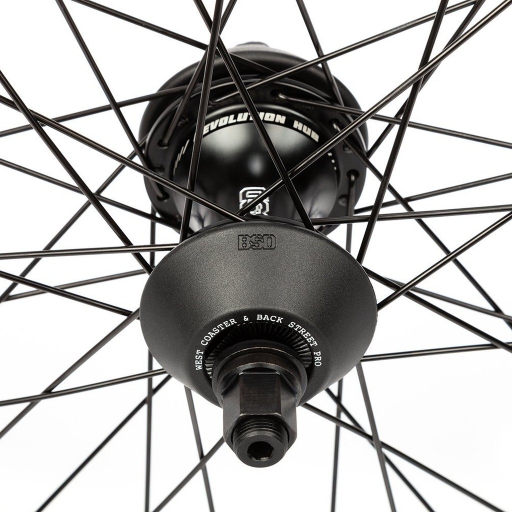 The Revolution is here! The latest complete rear freecoaster wheel built around the new lightweight Revolution Planetary freecoaster hub and super tough BSD NASA rim, using BSD spokes and rim tape. Includes Jersey Barrier hubguards.