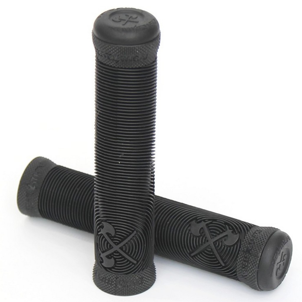 Demolition Axes Grips – Έχουν σχεδίαση με κυκλικές γραμμές και 2 τσεκούρια στην άκρη του χερουλιού. Είναι μέτρια στο πάχος, μαλακά και αντιολισθητικά στον ιδρώτα λόγο του Medium krayton υλικού τους. Το μήκος του είναι 150mm χωρίς φλάντζες και περιλαμβάνει 2 τάπες Demolition axes πλαστικές