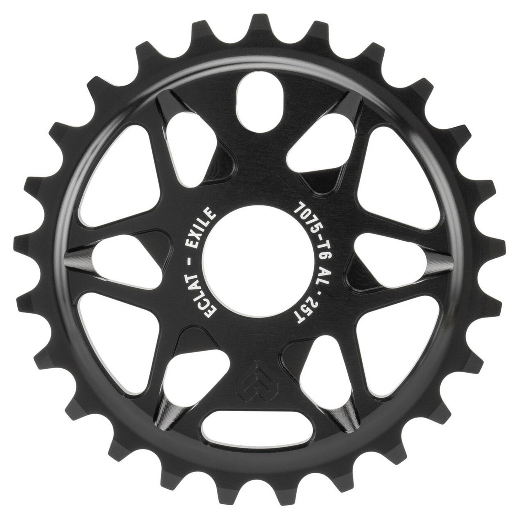 Eclat Exile Sprocket – Ο Exile έχει κατασκευαστεί για να street riding, είναι 7mm παχύς και το εξωτερικό προστατεύει στα Crank arm/ sprocket Grinds. Δεν στραβώνει και μπαίνει σχεδόν σε όλες τις πεταλιέρες aftermarket και σε άξονες από 19mm, 22mm, 24mm. Το υλικό κατασκευής είναι αεροπορικού τύπου αλουμίνιο 6061 Τ6 για να μείνει σε χαμηλό βάρος ενώ παράλληλα δίνει ένα πιο ωραίο Look στο BMX.